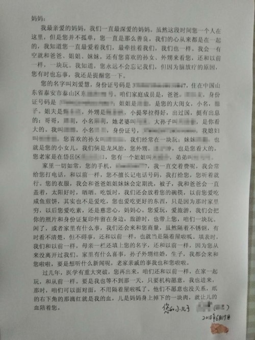 “您永遠(yuǎn)不會(huì)忘記我們,但因?yàn)槟X放療的原因,你有時(shí)也忘事,我還是提醒您一下”,母子情深,滴血為約,小兒子為了不讓母親忘卻現(xiàn)在的記憶,含淚寫下期盼喚醒母親未來記憶的信,信中寫道,“家里一切如常,您的手機(jī),我一直交著費(fèi)呢……”