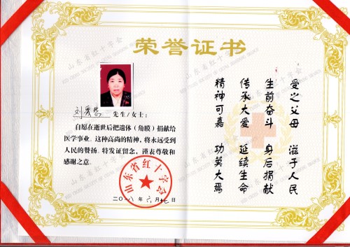 附:山東省紅十字會(huì)授予劉女士榮譽(yù)證書