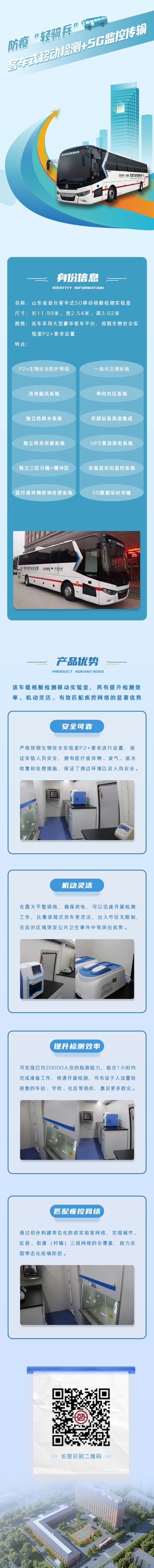 隨著新冠肺炎疫情防控的常態(tài)化,核酸檢測對于保障我們健康生活發(fā)揮著重要的作用。11月19日,由銀豐基因科技有限公司自主研發(fā)的山東省內(nèi)首臺客車式5G移動核酸檢測實驗室下線交付。該檢測車集自動化設(shè)備和實驗室管系統(tǒng)于一身,單車具備2萬人份/天的核酸混檢能力,最快可在2小時內(nèi)出結(jié)果,檢測數(shù)據(jù)實時傳輸,為常態(tài)化疫情防控提供有力支撐。
